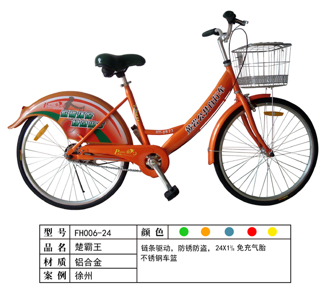 公共自行车,是“公共自行车出行系统”的简称。该系统通常以城市为单位进行部署、建设,由数据中心、驻车站点、驻车电子防盗锁、自行车(含随车锁具、车辆电子标签)及相应的通讯、监控设备组成。易安达公共自行车设备有限公司生产的FH006-24公共自行车,外形美观,质量上乘。FH006-24公共自行车服务租赁系统技术均为自行研发,并申请获得多项专利。国家提出绿色出行、低碳生活的理念和惠民政策实施之后,易安达人通过自己的努力研发了具有国内技术领先的公共自行车智能租赁服务控制系统及成套设备的研制。欢迎电话咨询:0511-86682401。 下一篇:FH004-24公共自行车 相关产品: