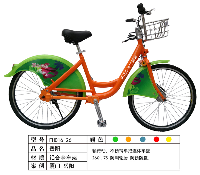 公共自行车,是“公共自行车出行系统”的简称。该系统通常以城市为单位进行部署、建设,由数据中心、驻车站点、驻车电子防盗锁、自行车(含随车锁具、车辆电子标签)及相应的通讯、监控设备组成。易安达公共自行车设备有限公司生产的FH016-26公共自行车,外形美观,质量上乘。FH016-26公共自行车服务租赁系统技术均为自行研发,并申请获得多项专利。国家提出绿色出行、低碳生活的理念和惠民政策实施之后,易安达人通过自己的努力研发了具有国内技术领先的公共自行车智能租赁服务控制系统及成套设备的研制。欢迎电话咨询:0511-86682401。 下一篇:FH016-26公共自行车 相关产品: