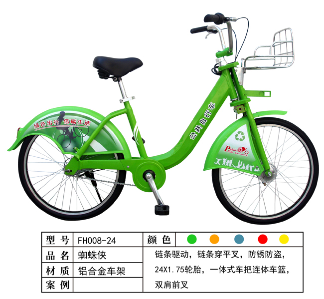 公共自行车,是“公共自行车出行系统”的简称。该系统通常以城市为单位进行部署、建设,由数据中心、驻车站点、驻车电子防盗锁、自行车(含随车锁具、车辆电子标签)及相应的通讯、监控设备组成。易安达公共自行车设备有限公司生产的FH008-24公共自行车,外形美观,质量上乘。FH008-24公共自行车服务租赁系统技术均为自行研发,并申请获得多项专利。国家提出绿色出行、低碳生活的理念和惠民政策实施之后,易安达人通过自己的努力研发了具有国内技术领先的公共自行车智能租赁服务控制系统及成套设备的研制。欢迎电话咨询:0511-86682401。 下一篇:FH013-26公共自行车 相关产品:
