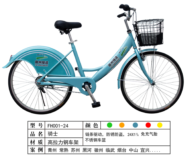 公共自行车,是“公共自行车出行系统”的简称。该系统通常以城市为单位进行部署、建设,由数据中心、驻车站点、驻车电子防盗锁、自行车(含随车锁具、车辆电子标签)及相应的通讯、监控设备组成。易安达公共自行车设备有限公司生产的FH001-24公共自行车,外形美观,质量上乘。FH001-24公共自行车服务租赁系统技术均为自行研发,并申请获得多项专利。国家提出绿色出行、低碳生活的理念和惠民政策实施之后,易安达人通过自己的努力研发了具有国内技术领先的公共自行车智能租赁服务控制系统及成套设备的研制。欢迎电话咨询:0511-86682401。 下一篇:FH009-26公共自行车 相关产品: